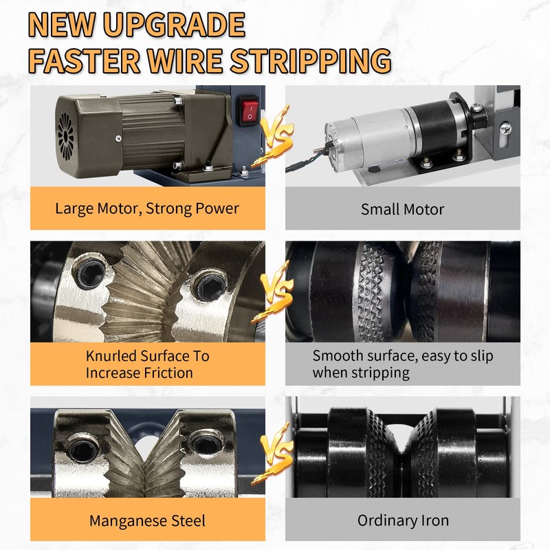 - 25W Large Motor: ①【Faster】Compared with other wire stripping machines, the 10W motor has more high efficiency stripping and stable performance than 25W motor, maximizing productivity ②【Better】Low noise and fast heat dissipation during operation.③ The sharp blade made of high strength special alloy can quickly cut through the plastic or rubber insulation of the waste wire.