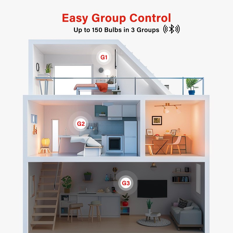 - 【Group Control】Group control without the need for a network. One remote can control up to 150 LED light bulbs and up to 3 groups.You can use the remote to control Different rooms like Livingroom, Bedroom, Kitchen separately. You can also control all the bulbs with the button "All".