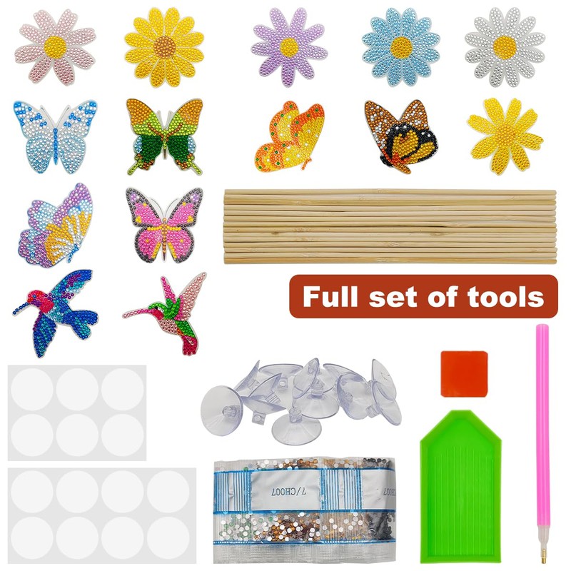 - Diamond Paintings for Adults: The diamond art painting kit includes14 pcs butterfly, flower, and bird diamond kits, 14 pcs bamboo sticks, 14 pcs suction cups, 14 pcs double sided stickers,1 pc diamond pen, 1 pc dot diamond tray, 1 pc clay adhesive and full set of diamonds.