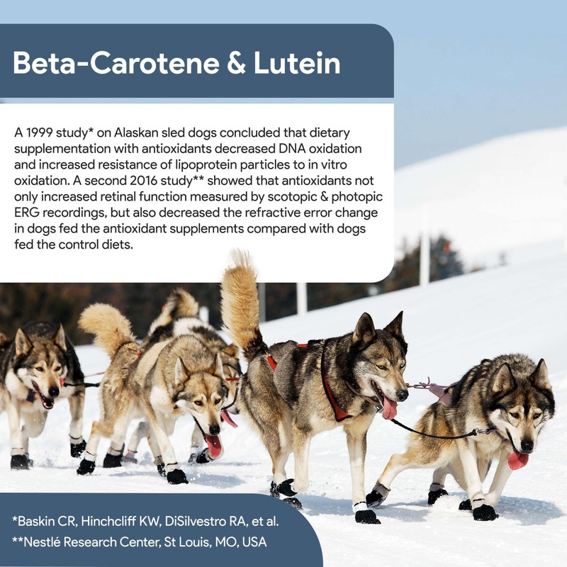 - These vision bites for dogs contain beta carotene converts to vitamin A, which is good for eye health. Lutein and astaxanthin are both antioxidants that can protect eyes from oxidative stress, which can improve vision and support retinal lens health.