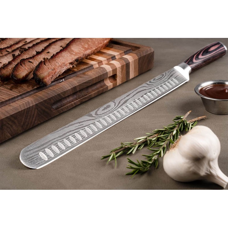 - đȘăBeautiful Damascus PatternăThe Brisket Knife is laser-etched with an elegant Damascus pattern and has an smoothly-finished wooden handle.