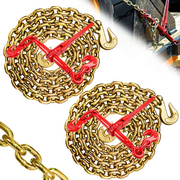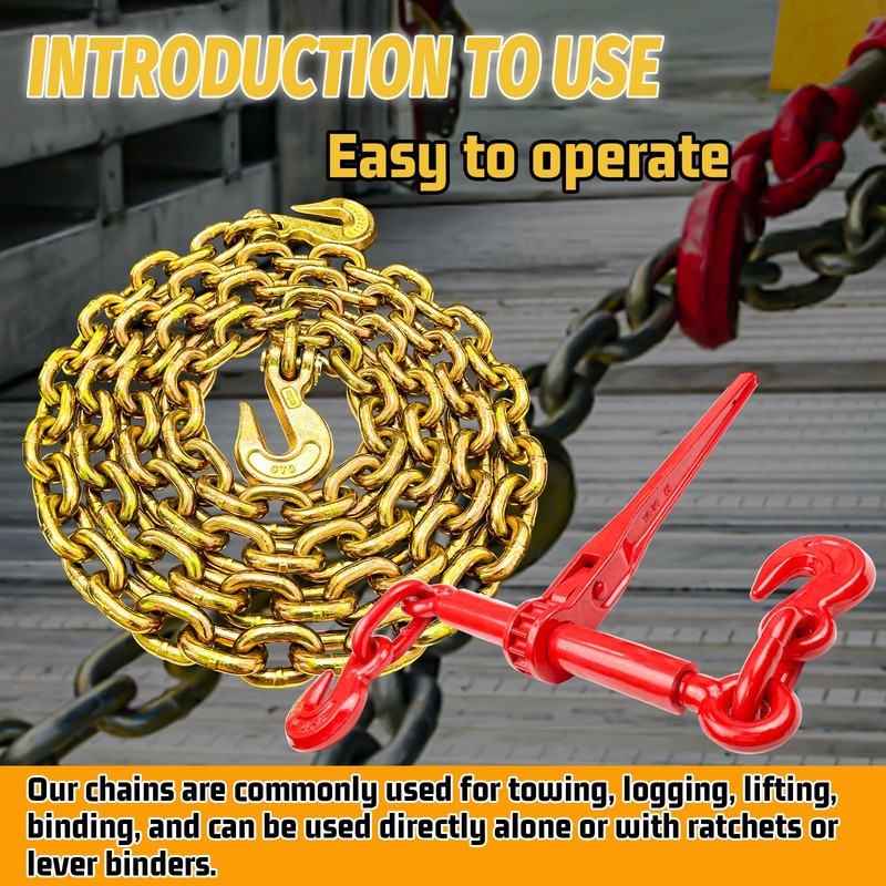 - 💪[UPGRADE STRENGTH] - 3/8 Inch × 10 FT transport chains and 3/8 inch to 1/2 inch chain binders are made of high strength alloy and forging process. With stronger strength and fatigue resistance, it is very suitable for transporting load equipment requiring high load capacity.