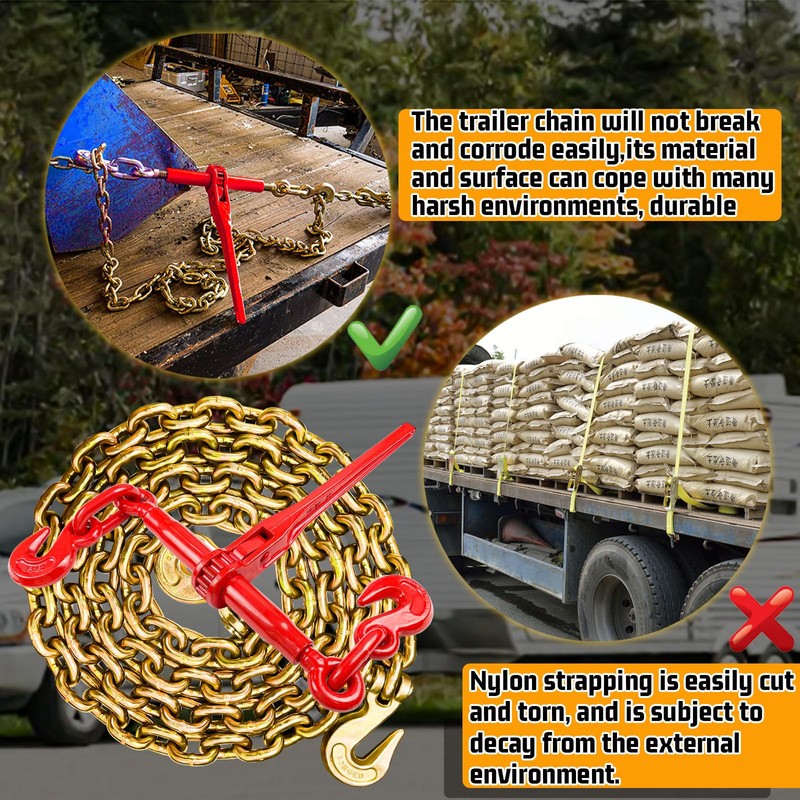 - 💪[ANTI-RUST AND DURABLE] - High-quality surface treatment is easier to identify and makes the chain and binder more resistant to wear. The yellow galvanized and red finish is corrosion resistant,allowing you to use it in any situation and store it easily. The strength and durability of trailer chains and binders make them ideal for towing heavy loads.