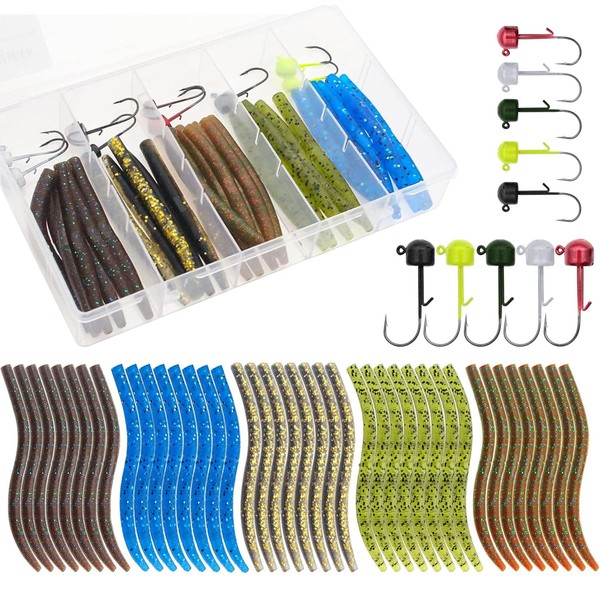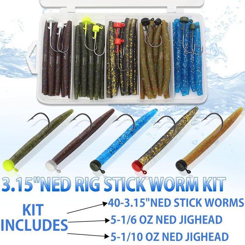 • 【50 Pieces Senko Worms kit】The bass fishing lures come with 5 colors, pieces of 40 3.15 inch Senko Worms, 10 pieces of ned jig head hooks.Comes with a fishing box, easy to carry.