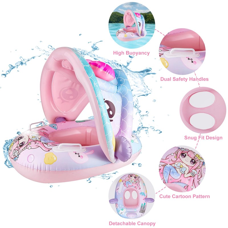 - Protection from the sun: the swimming seat has a removable sun canopy that reliably protects your baby from harmful UV rays. Perfect for use by the pool or beach so your baby can play in the shade without exposing themselves to the sun.