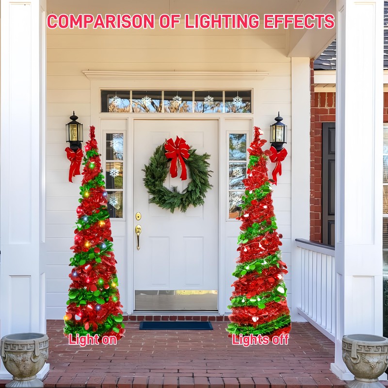 - Fast Assemble and Easy Storage: With a unique pop-up and collapsible design, you only need 2minutes to install the Christmas tree ready. Just connect different metal pipes, form a base, and put the tree up, that's all. You can warp the multicolor led light evenly around the tree to make it unique and eye-catching. This pencil trees is convenient for you to take it off and put back in a box, reusable for the next holiday.