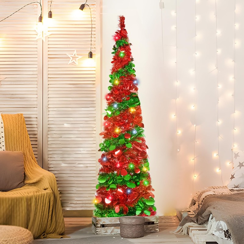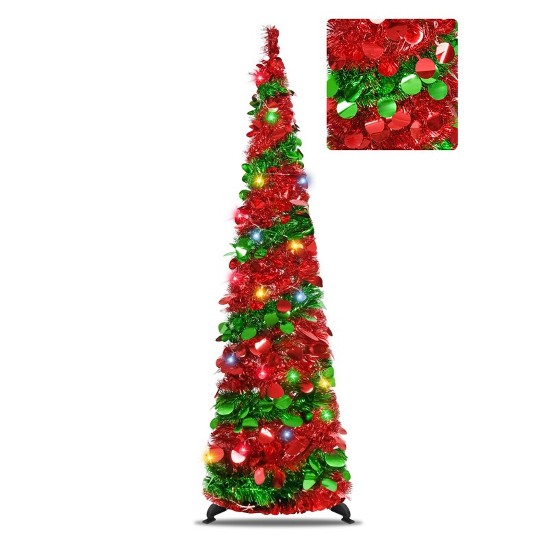 - 5 Ft Pop Up Christmas Tree with Lights: This artificial Christmas tree is designed with gold tinsel, It comes with a battery-operated 50 LED light string,