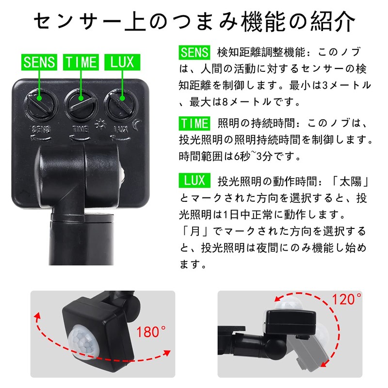 - Adjustable: 1, SENS / Reaction Distance: The reaction distance of the human body can be adjusted between 9.8 - 17.6 ft (3 - 8 m). 2, TIME/Lighting Time: The light can be adjusted from 5 seconds to 180 seconds. 3, LUX operation mode adjustment: When you choose the sun grade, it can work 24 hours; when it reaches "moon", the sensor will work at night or in a dim environment