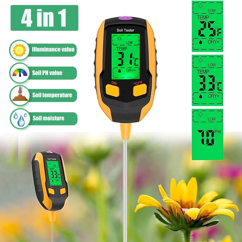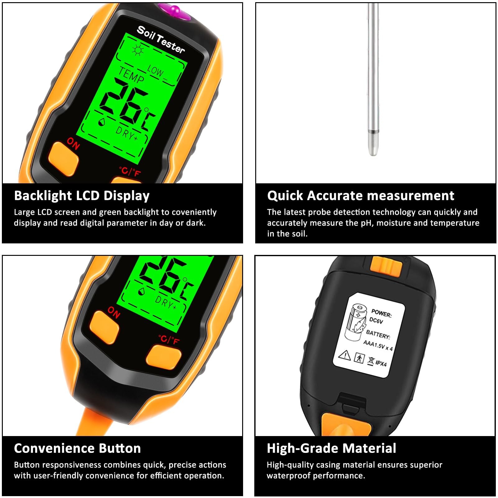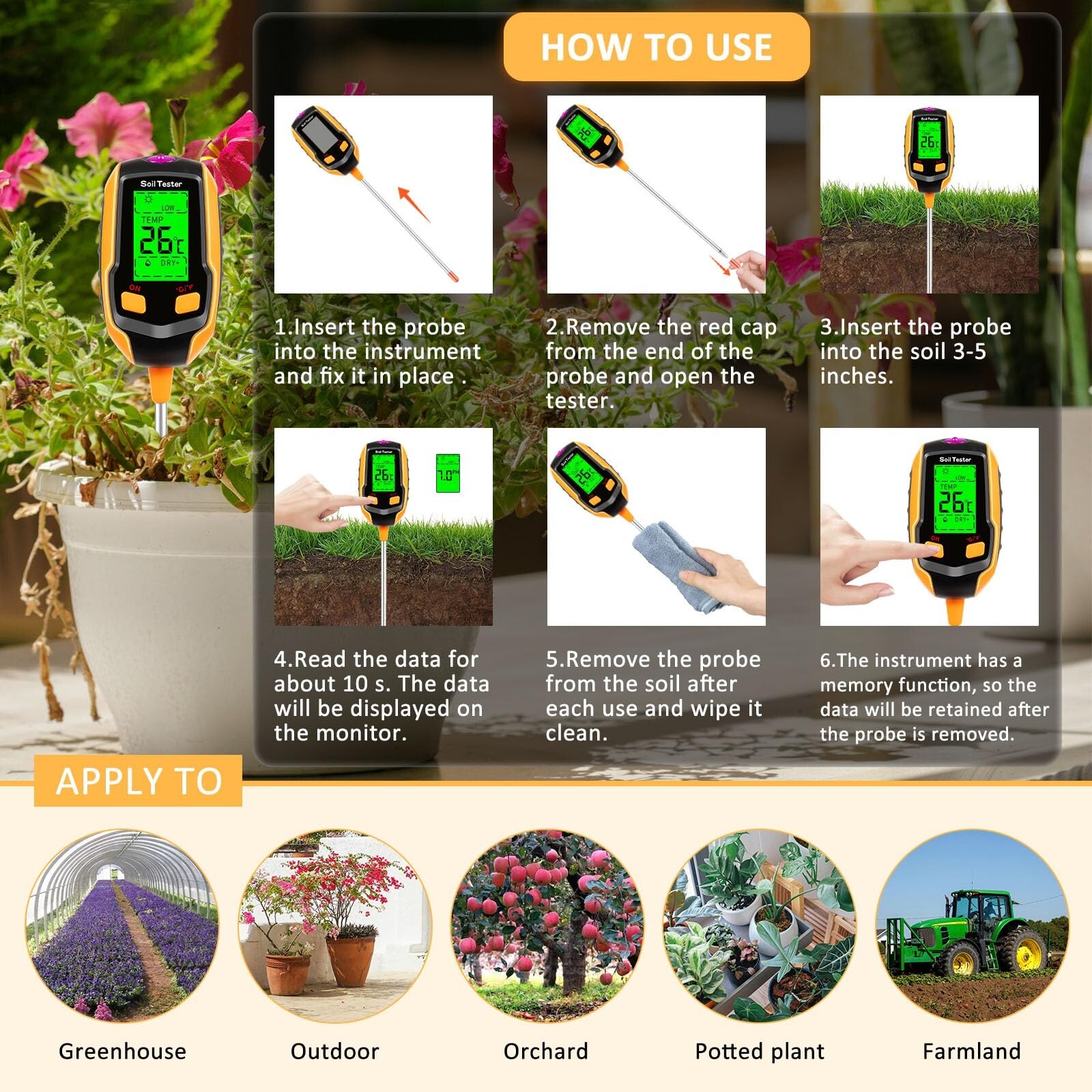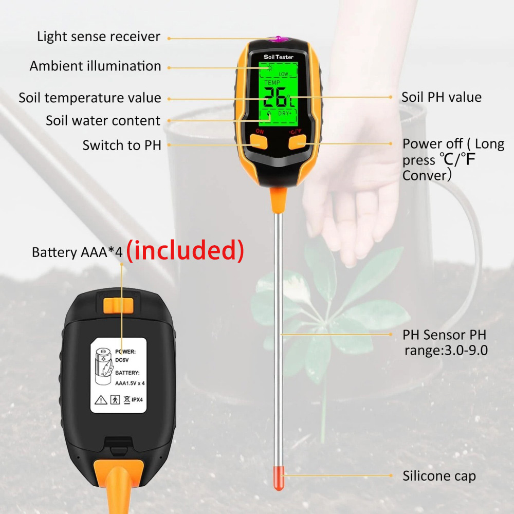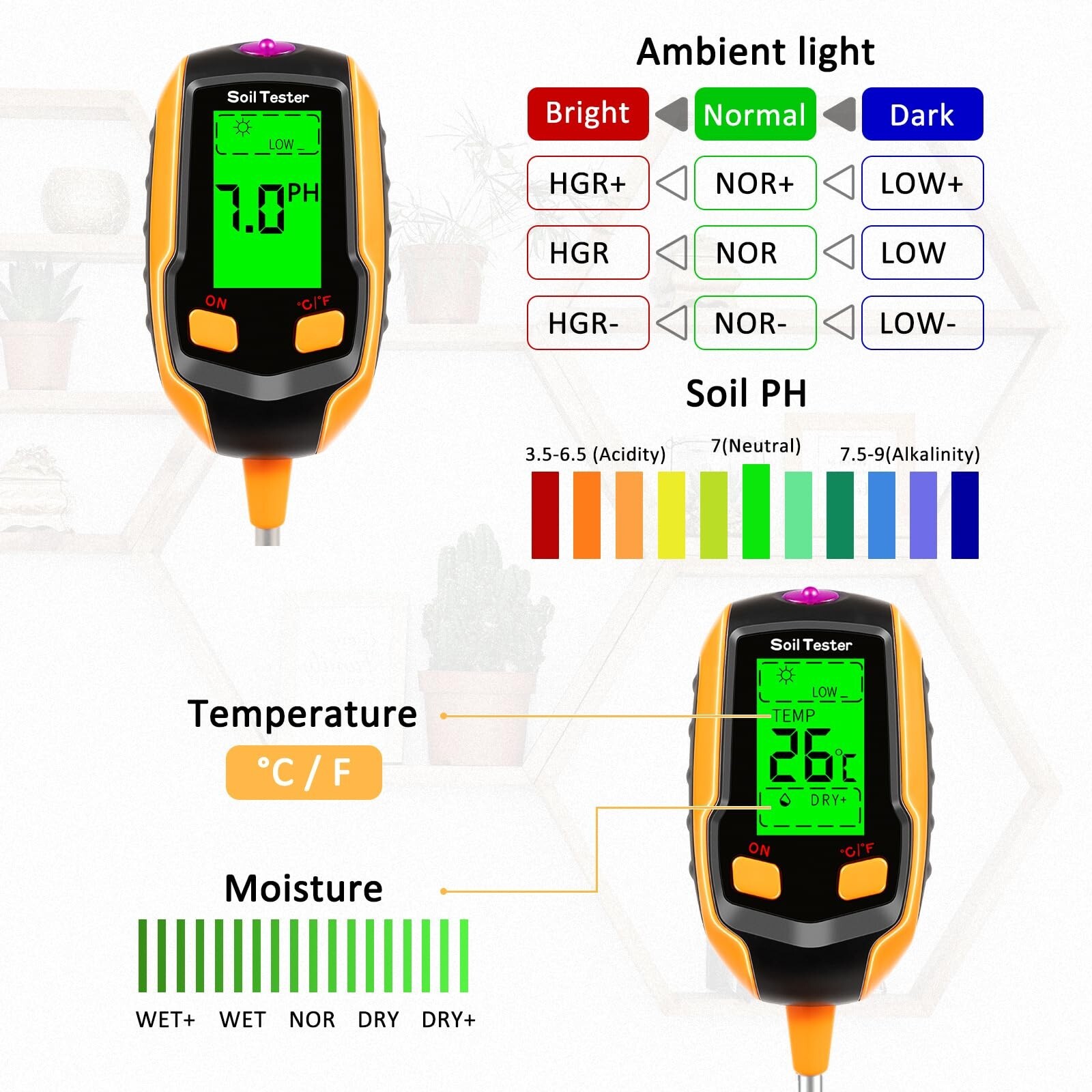 【4 in 1 function】This is a 4-in-1 multifunctional soil tester.Our soil tester fastly to measure soil moisture,