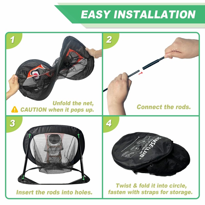 - EASY ASSEMBLY & CARRY:⛳️ You can setup and takedown the net in 30s without any tool. Easy to fold the pop up net into a carrying bag for outdoor use.