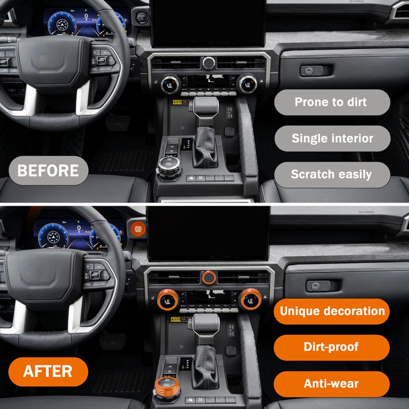 - Models: Our knob cover set fit for Toyota Tacoma accessories 2024 2025 (NOTE: fits vehicles with 14-inch screen, some knob covers fit vehicles with 8-inch screen), please review the product images before purchasing