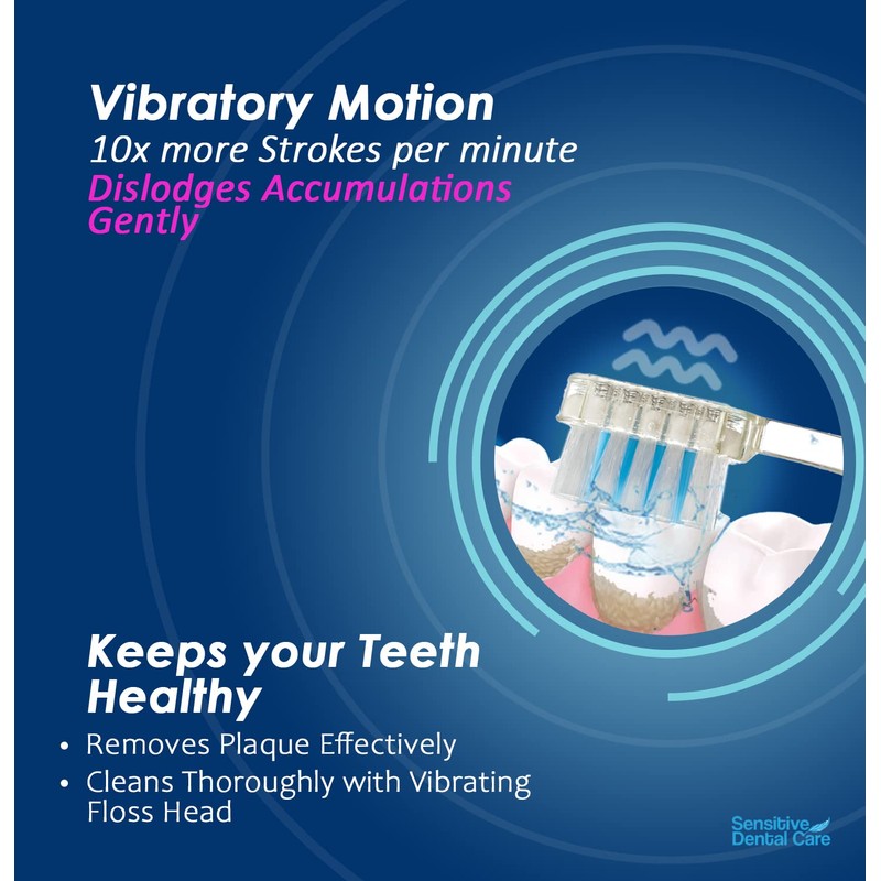 Sensitive Dental Care Battery Powered Toothbrush - Retractable Soft Bristle with Pressure Relief and Vibrating Floss Head, 5 Floss Clips, 2 Brush Heads, Travel Pouch, Bathroom Stand