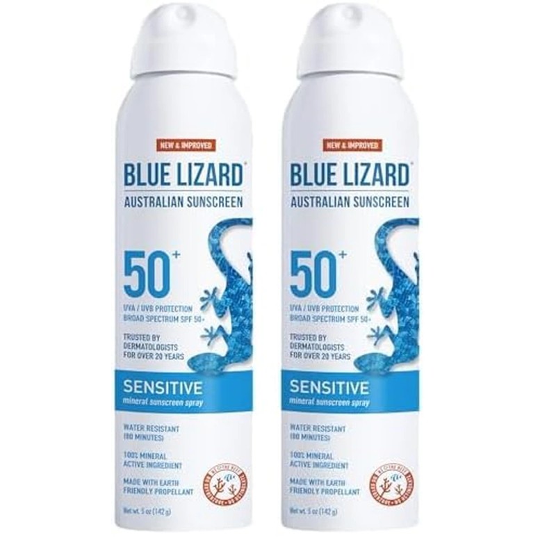 Blue Lizard Australian Sunscreen’s Sensitive Mineral Spray Sunscreen is sun protection that’s gentle on skin and easy to apply. Enjoy the convenience of spray-on sun protection with broad spectrum UVA / UVB protection. This Zinc Oxide spray sunscreen is also free from chemical active ingredients and harmful airborne titanium dioxide that can be found in other spray sunscreens. Fragrance-free and paraben-free, this SPF 50+ mineral sunscreen is ideal for sensitive skin. With 80 minutes of sweat resistance and water resistance, this adventure-ready sun protection rubs in smooth and dries clear, so you don’t have to worry about your SPF showing. Blue Lizard spray sunscreens are enriched with antioxidants and skin nourishing botanicals to leave skin feeling smooth and not sticky. Love your skin and the planet. Blue Lizard spray sunscreens use consciously selected ingredients and an earth-friendly propellant with an ultra-low global warming potential. They are also free from Oxybenzone and no Octinoxate to help protect delicate coral reefs. Blue Lizard Australian Sunscreen has been trusted by dermatologists for over 20 years.