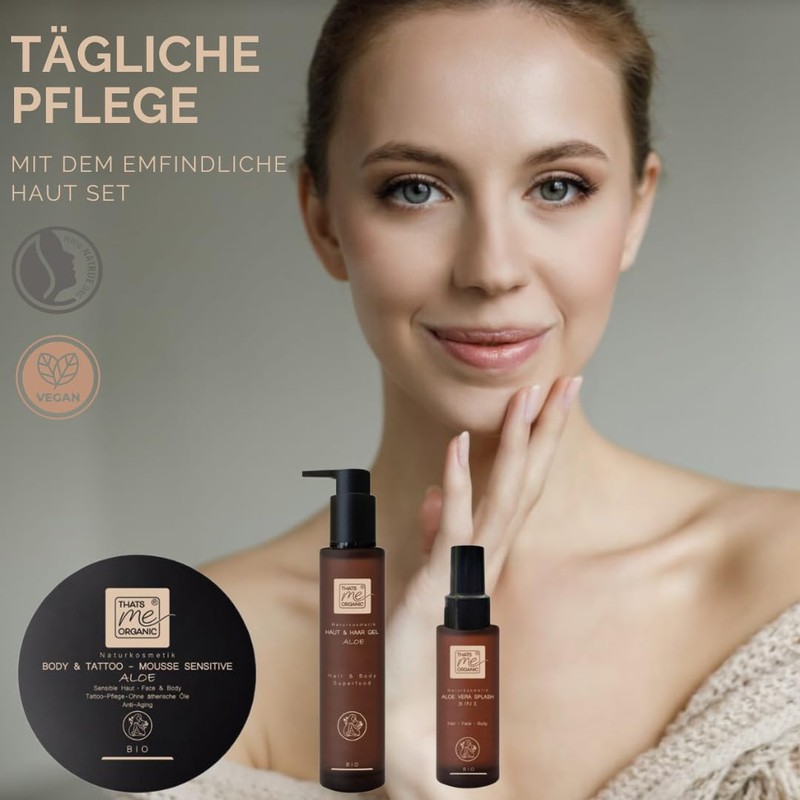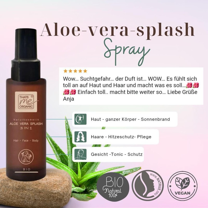 Aloe Vera Splash Our Aloe Vera Splash is a true miracle cure for sensitive skin. It soothes, refreshes and moisturises - all in one product. With real organic aloe vera from organic plantations, this spray provides the gentle care that sensitive skin needs. Whether as a face tonic, refreshment in summer or to support your skin care - this splash is versatile and effective. Hair also loves this moisturising spray. Very popular as a scalp tonic.