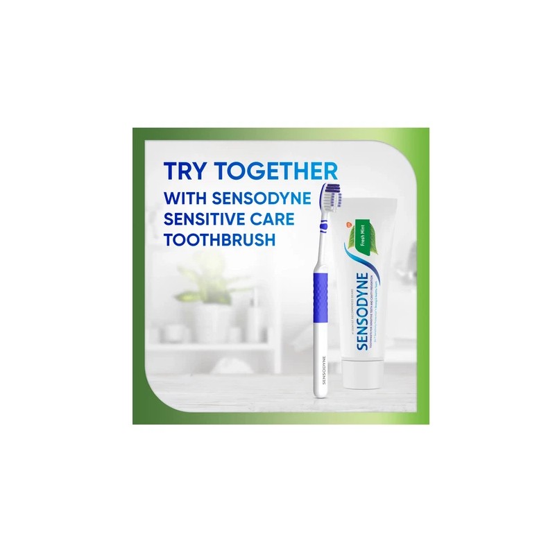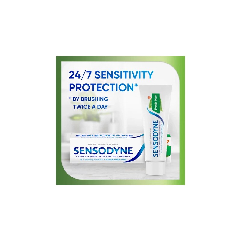 Sensodyne Fresh Mint Sensitive Toothpaste provides lasting sensitivity relief and protection, with a mint flavor that keeps your mouth feeling fresh and clean. This potassium nitrate and sodium fluoride toothpaste protects exposed areas of dentin and works deep inside the tooth to calm the nerves, for long-lasting sensitivity protection. With twice daily brushing, this SLS free toothpaste delivers the same cavity protection benefits of regular anticavity toothpaste, for healthy teeth and fresh breath. Available in a convenient twin pack, this toothpaste for sensitive teeth keeps you stocked for longer. For best results, brush for two minutes, twice daily. Get lasting protection from tooth sensitivity with Sensodyne.