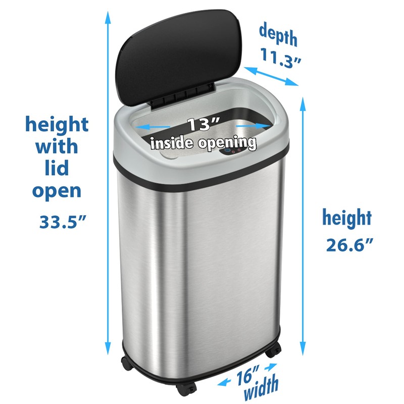 13 gallon sensor trash can with wheels convenient and hygienic, Sensor Can automatic trash can is the easy and clean way to dispose of trash in your home or office. Just move your hand toward the lid and the infrared motion sensor will open the lid automatically. The lid will close automatically when you are finished. It’s easy and hygienic! it’s mobile! Four removable wheels on the bottom make it easy to move from room to room with ease! premium features: 1 year manufacturer’s included! Infrared motion sensor opens the lid automatically with just the motion of your hand – 100% touch-free! Removable caster wheels allow you to move the can wherever you need with ease. Wheels lock to keep the can in place. 13 gallon Capacity holds lots of trash so you can empty the can less frequently elegant and stylish stainless steel can body is fingerprint-proof and smudge-resistant. Abs plastic lid is durable and easy to clean slim oval shape allows it to fit comfortably into any setting trash bag retainer ring keeps bags firmly in place and tucked out of view fits standard 13 gallon Kitchen trash bags. No custom bags required. Powered by 4 D batteries (not included) or optional AC adapter (sold separately)