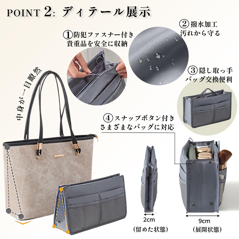 - (Lightweight, Large Capacity, Freestanding) Weighing only 3.2 oz (90 g), it is surprisingly light enough to fit in a tote bag. There are 13 pockets that can be sorted (3 large and 10 small). Two large anti-theft zipper pockets can safely store your wallet and important accessories, and the 10 small pockets neatly organize your smartphone, keys, pens, business cards, handkerchiefs, etc. It has a large capacity design that can fit your iPad, making it perfect for organizing your belongings when commuting to work or on business trips