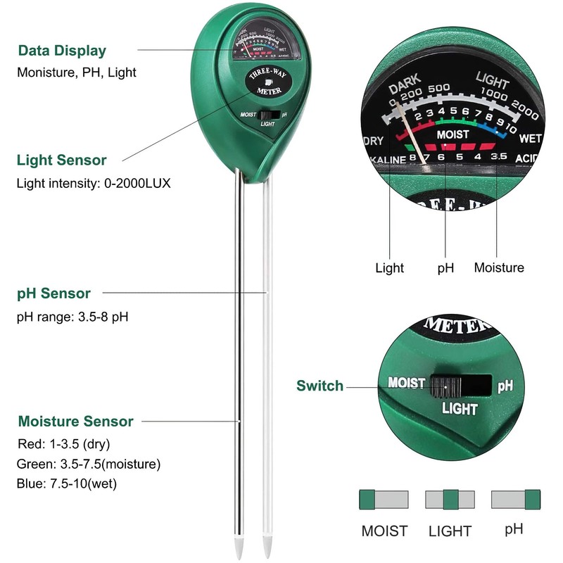 - 🌱 【3-IN-1】This is a great tool to get quick and accurate information regarding adequate WATER/LIGHT and pH levels. Make your plants grow healthy and strong.