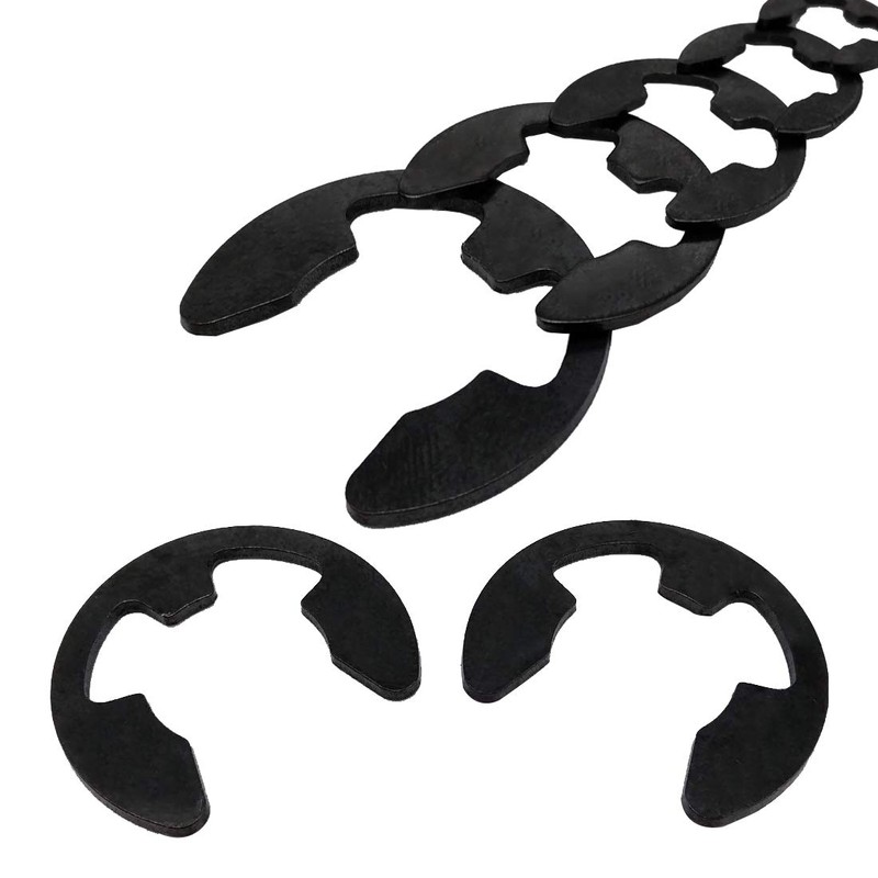 Circlip shape e-type, made of carbon steel manganese steel, high hardness and durability, and it will not fall off, and it will clog the parts.