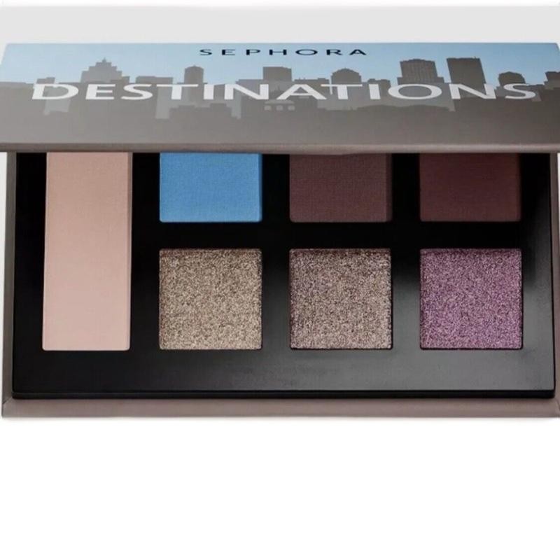 - Ingredients: Item description from the seller Brand new in box Limited Edition Sephora collection Sephora Collection Destinations Eyeshadow Palette SHADES: matte cool beige base shade, matte sky blue, matte taupe grey, matte deep taupe, pewter shimmer, taupe shimmer, metallic mahogany A versatile eyeshadow palette featuring seven perfectly paired matte, shimmer, and metallic colorful shades. Pack your bags—it’s time for a beautiful getaway. The shades are easy to apply at home or on the go. This travel-friendly palette also include a large mirror. Ask questions before bidding Shipping is USPS next business day No partial refunds, returns are only if item is not as described,Non animal cruelty