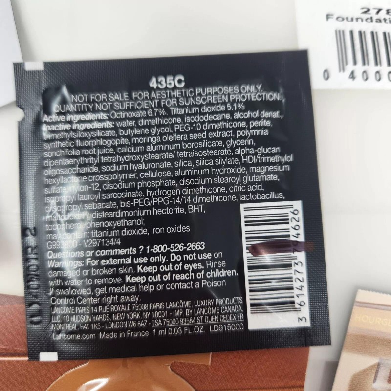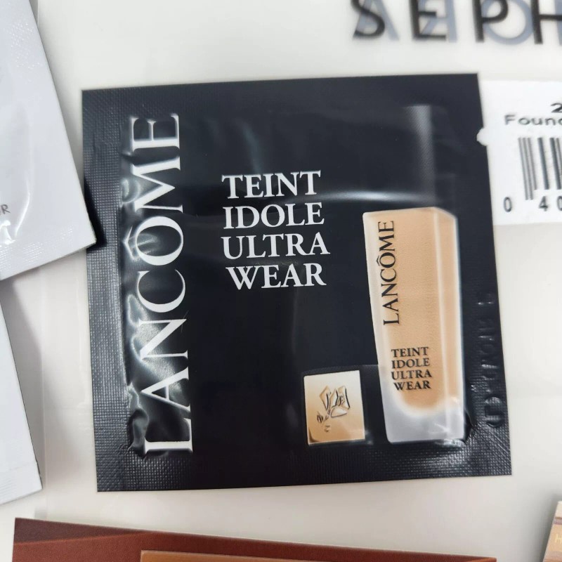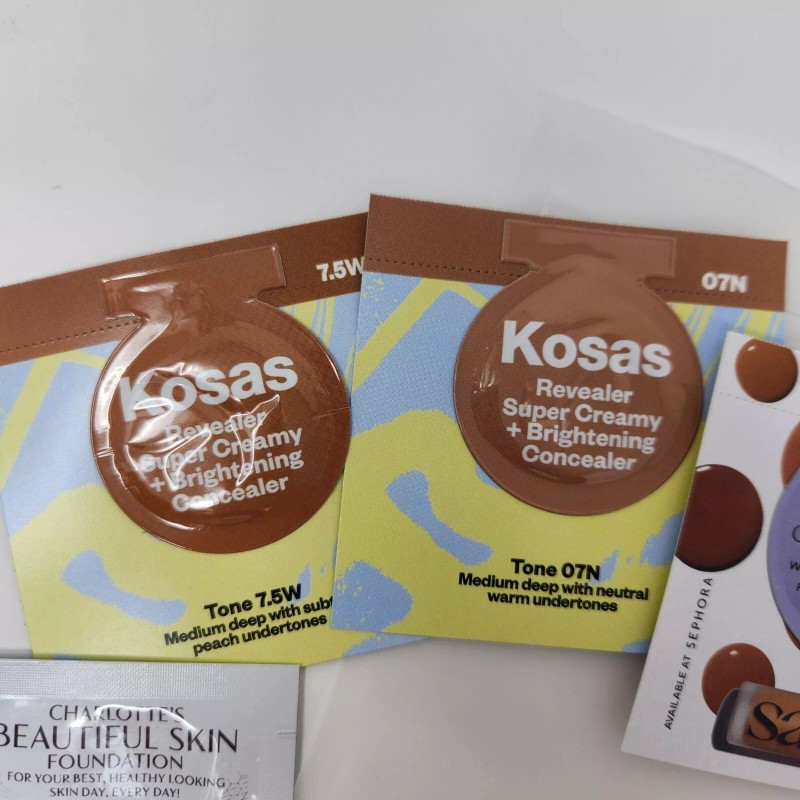 • Assorted foundation samples from the following brands: Lancome Idole Ultra Wear, Giorgio Armani, Charlotte Tilbury, Makeup Forever HD Skin, Saie Glowy Superskin, Hourglass, Kosas Revealer