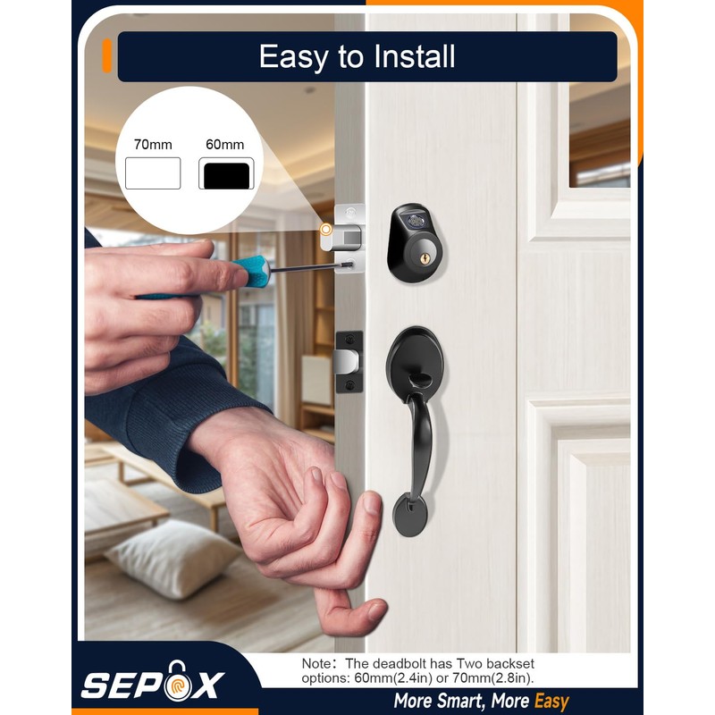 • 【Effortless and Easy to Install】SEPOX door lock fits for most US standard left and right hand doors. You can easily install it in a few minutes without drilling. Deadbolt lock fit door thicknesses from 1-3/8" to 2-1/8" (35mm - 55mm), backset 2-3/8" (60mm) and 2-3/4" (70mm). VIDEO GUIDE will walk you through the whole setting process.