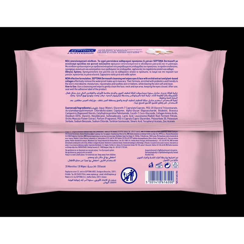 New effective formulation. SEPTONA Dermasoft cleansing wet wipes eyes & face with orchid extract and plant-based collagen, effectively remove the waterproof make up & mascara. Their formula, enriched with prebiotics and friendly to the skin’s microbiome, moisturizes, rejuvenates and soothes skin irritations, while leaving the skin soft and clean.