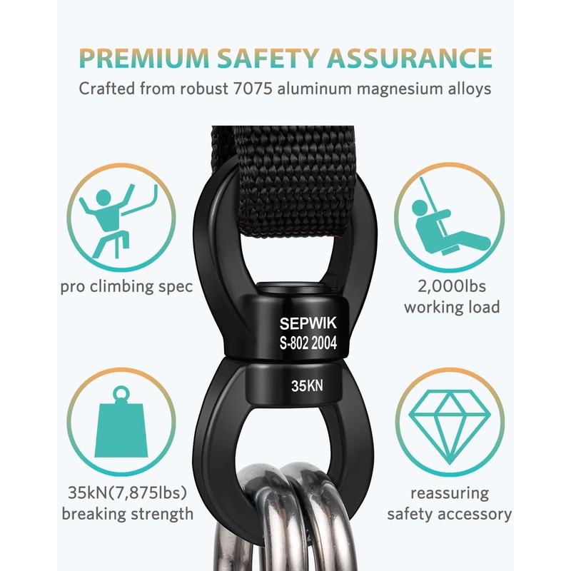 • ✔ PREMIUM SAFETY ASSURANCE -- Crafted from robust 7075 aluminum magnesium alloys with a sleek anodized finish, SEPWIK's safety rotational device boasts top-tier industrial-grade quality. It surpasses rigorous testing with a 35KN (7,875lbs) breaking strength and is recommended for a working load limit of 2,000lbs, ensuring unparalleled safety.