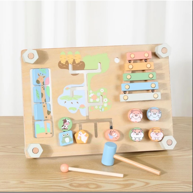 MULTI-FUNCTIONAL DESIGN: Features a xylophone, sliding puzzle, rotating dials, and animal-themed elements all on one wooden board for diverse learning experiences