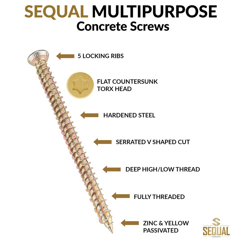 SEQUAL® 70mm (Pack of 20) Easy Drive Countersunk Direct Concrete Screws. No Plugs Needed Concrete Screw Pack Countersunk Screw with Torx Head, T30 Torx Driver Bit Included in Every Screw Pack.