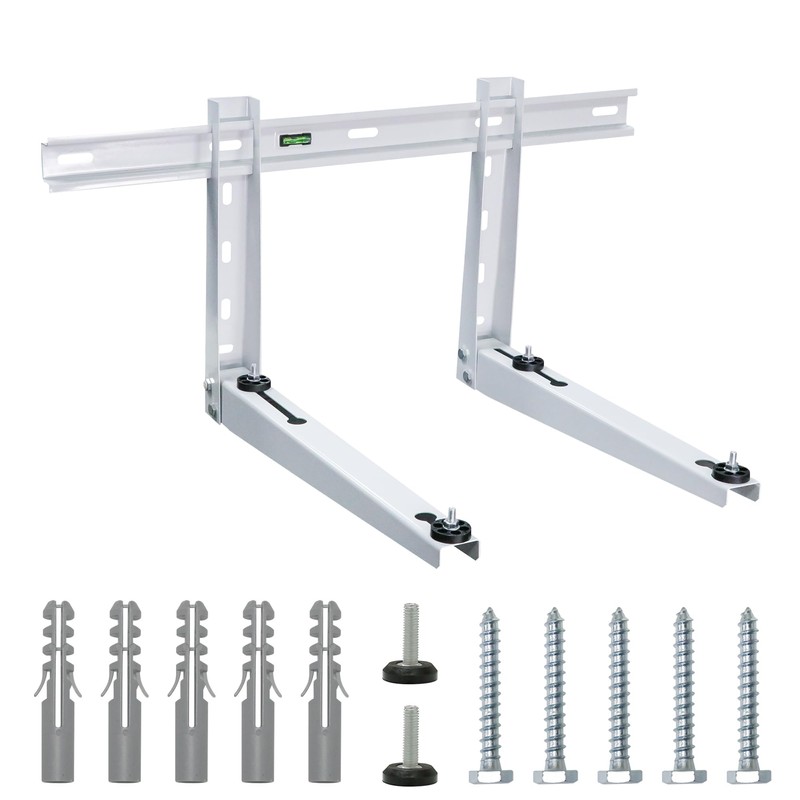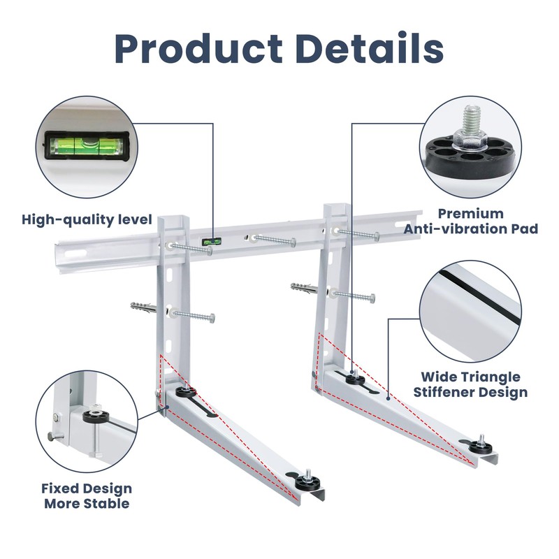 • Additional advantages: Four rubber pads reduce vibration transfer from the unit to the wall brackets, making your AC quieter. The built-in spirit level helps adjust the mounting slope, while angle regulators on the vertical arms allow easy distance adjustment between the bracket and the wall