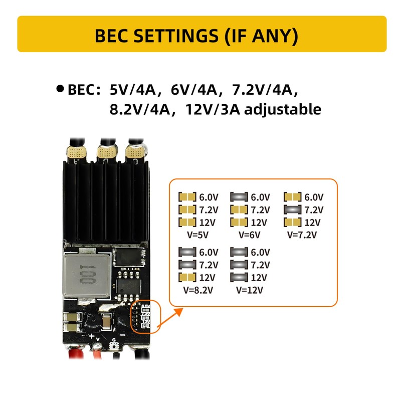 - BEC supports adjustable outputs of 5V/4A, 6V/4A, 7.2V/4A, 8.2V/4A, and 12V/3A, which can directly supply power to external devices such as receivers and servos.