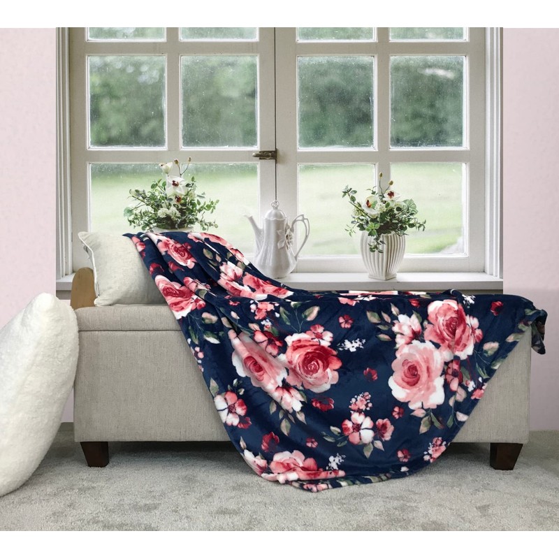 Serafina Home Throw Blanket: Velvelty Soft, Durable Fleece Accent for Bed or Couch (Navy with Pink Roses, 50 x 70 inches)