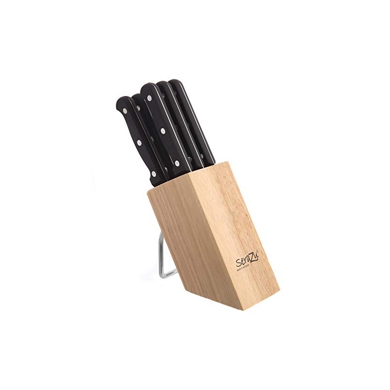 - Juego de 6 cuchillos para carne con filo ondulado, incluye 1 bloque de madera para su almacenamiento