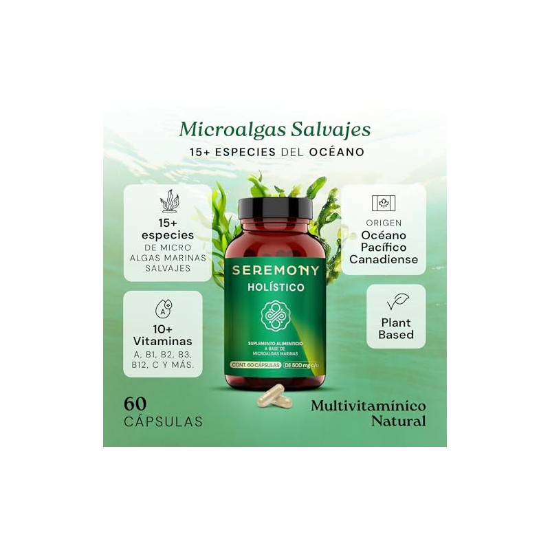 SEREMONY - Multivitamnico Vegano a base de Microalgas Marinas Salvajes - 60 Cpsulas - Mezcla de Microalgas con Vitaminas A, B, C y E, Aminocidos...
