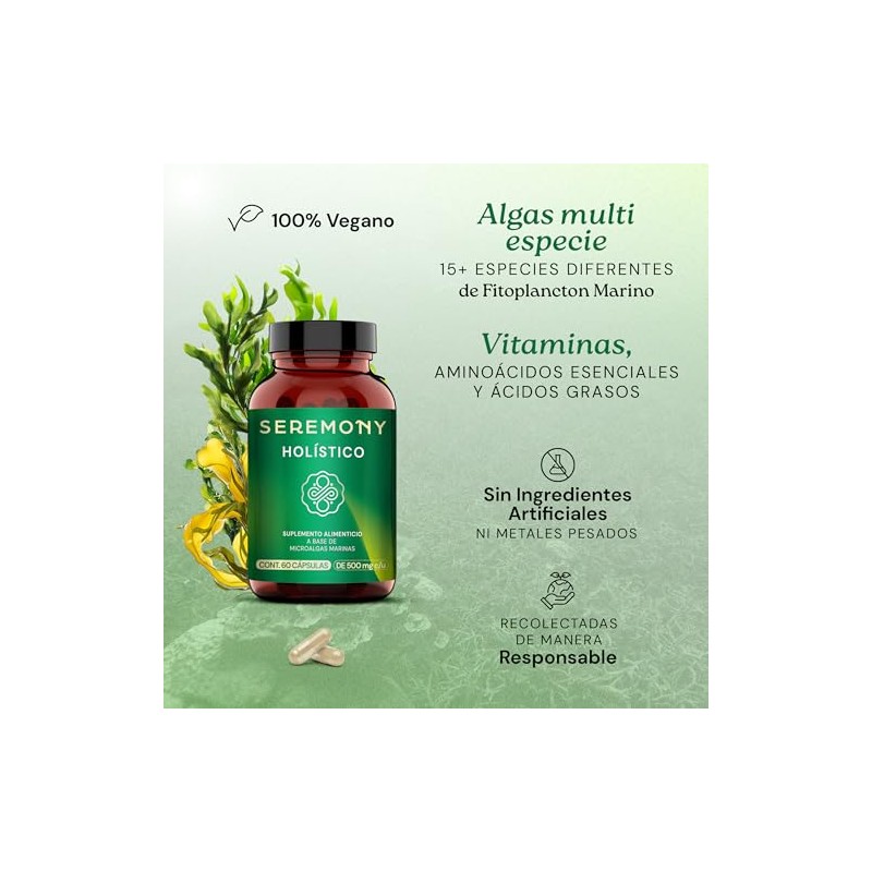 🌟 ⭐ SEREMONY - Multivitamínico Vegano a base de Microalgas Marinas Salvajes - 60 Cápsulas - Mezcla de Microalgas con Vitaminas A, B, C y E, Aminoácidos Esenciales y Ácidos Grasos - Fitoplancton Marino - 100% Natural - Holístico ⭐ 🌟
