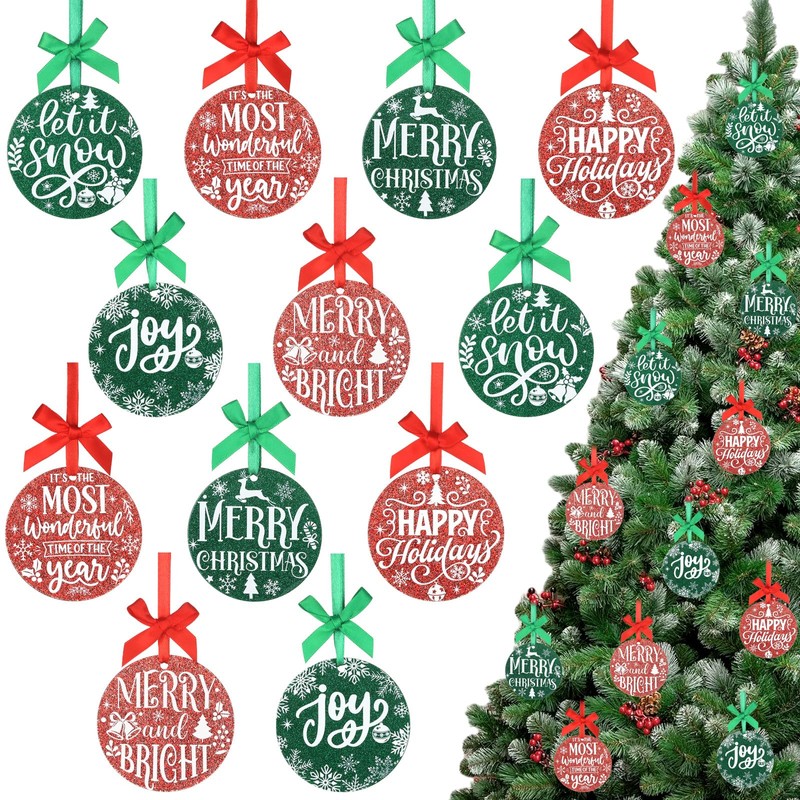 - Glitter Powder Design: These red and green Christmas tree ornaments feature charming sparkling Christmas patterns and come in 6 different styles and words, such as “Happy Holidays” “Merry & Bright” “Let It Snow”. These Christmas acrylic ornaments are good decoration for winter holiday party, bringing a more warm Xmas atmosphere