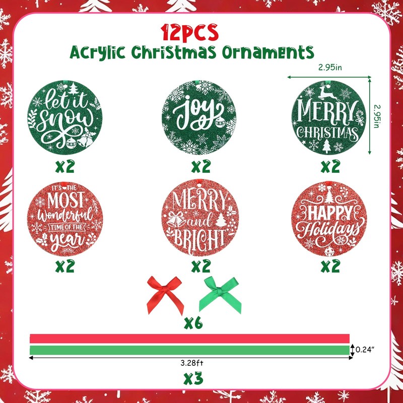 - 12PCS Red and Green Acrylic Christmas Ornaments: You will receive 6pcs red acrylic Christmas ornaments, 6pcs green acrylic Christmas ornaments, measuring 2.95x2.95inches, 6x red ribbon bow, 6x green ribbon bow, 6 pcs ribbon(red and green) for you to decorate and hang these Christmas acrylic ornaments