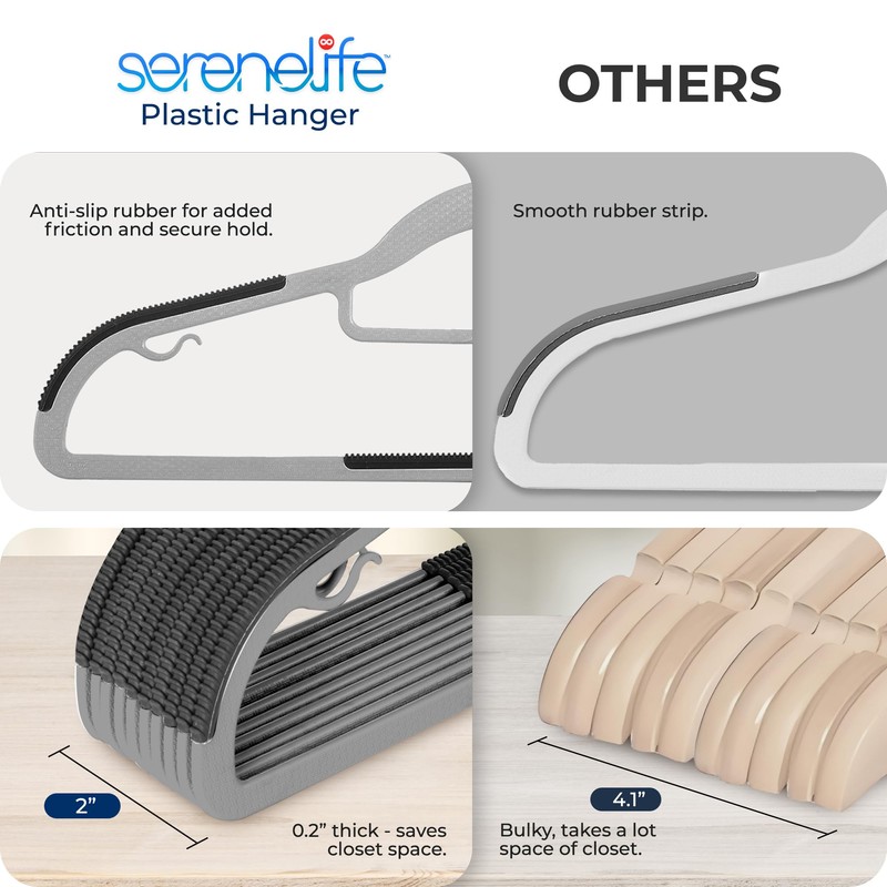 SereneLife 50-Pack Grey Plastic Clothes Hangers – Durable, Non-Slip Slim Hangers with 360° Swivel Chrome Hooks, Space-Saving Ultra-Thin Design for Shirts, Coats, Dresses & Closet Organization