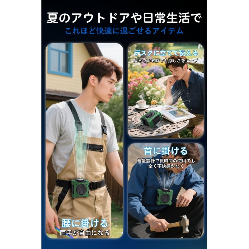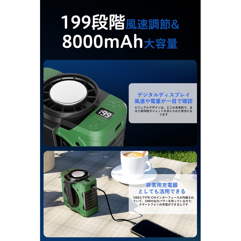 - 8,000 mAh Large Capacity & Mobile Battery Function: This fan has a built-in 8,000 mAh high capacity battery that can be used in a wide variety of outdoor activities and daily life. Not only does it provide coolness, but it can also be used as a power bank in an emergency, it can also charge your smartphone or tablet smoothly. Supports USB-A and USB-C ports (5V/2A output) to charge a variety of devices