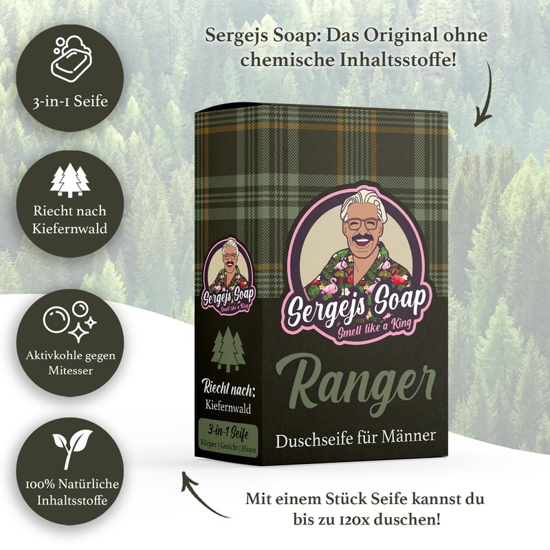Sergejs Soap - Ranger | Solid Soap Bar 3 in 1 Soap with 100% Natural Ingredients and Activated Carbon | Fragrance: Pine Forest | Natural Cosmetics | Free from Silicones