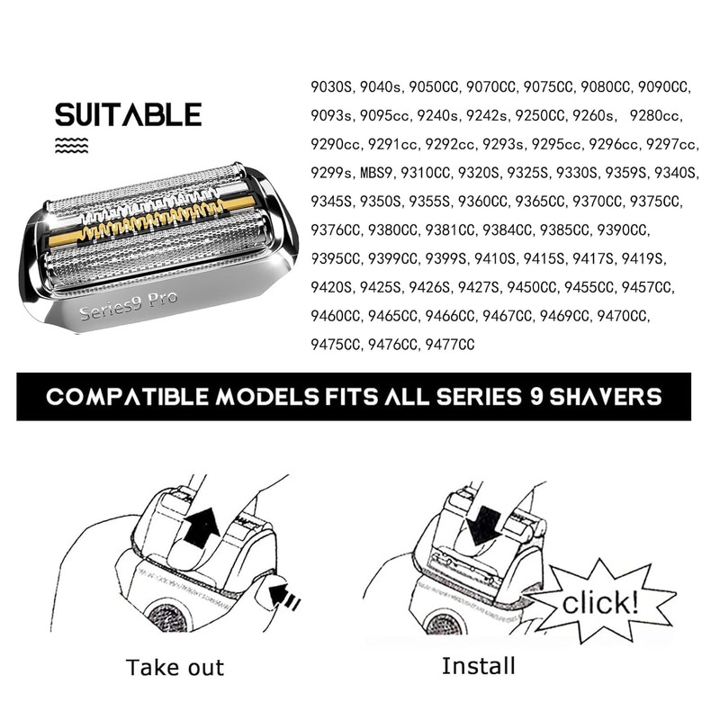 - BROAD COMPATIBILITY -The 94M Replacement foil and cutter are compatible with Braun series 9 pro replacement head 9030S,9240s,9242s,9250CC,9260s,9280cc,9290cc,9291cc,9292cc,9293s,9295cc,9296cc,9297cc,9299s,9310CC,9320S,9325S,9330S,9359S,9340S,9345S,9350S,9355S,9360CC,9365CC,9370CC,9375CC,9376CC,9380CC,9381CC,9384CC,9385CC,9390CC,9395CC,9399CC,9399S,9410S,9415S,9417S,9419S,9420S,9425S,9426S,9427S,9450CC,9455CC,9457CC,9467CC,9469CC,9470CC,9475CC,9476CC,9477CC and so on.Follows the contours of your face allowing you to effectively and comfortably trim and shave all areas of your face.