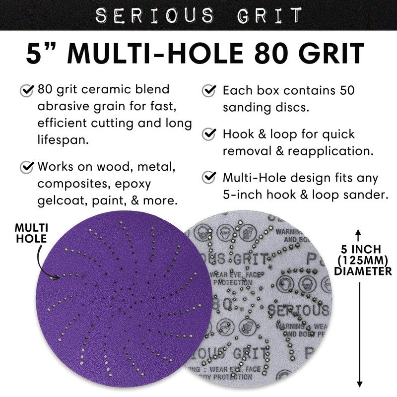 Serious Grit 5-Inch 80 Grit Ceramic Multi-Hole Hook & Loop Sanding Discs - Advanced Grain for Fast Cutting & Long Life - Film-Backed Universal Fit Sandpaper for 5-in Sanders - 50 Pack Box