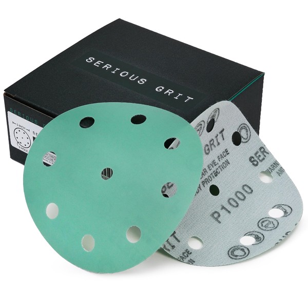 Serious Grit - 5-Inch 9-Hole 1000 Grit Sanding Discs - Heavy-Duty Hook & Loop Film Discs - Sandpaper for Random Orbital Sanders - 50 Pack Box
