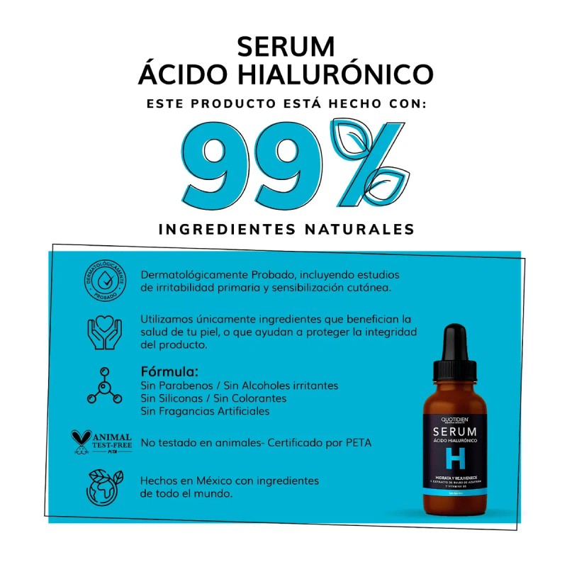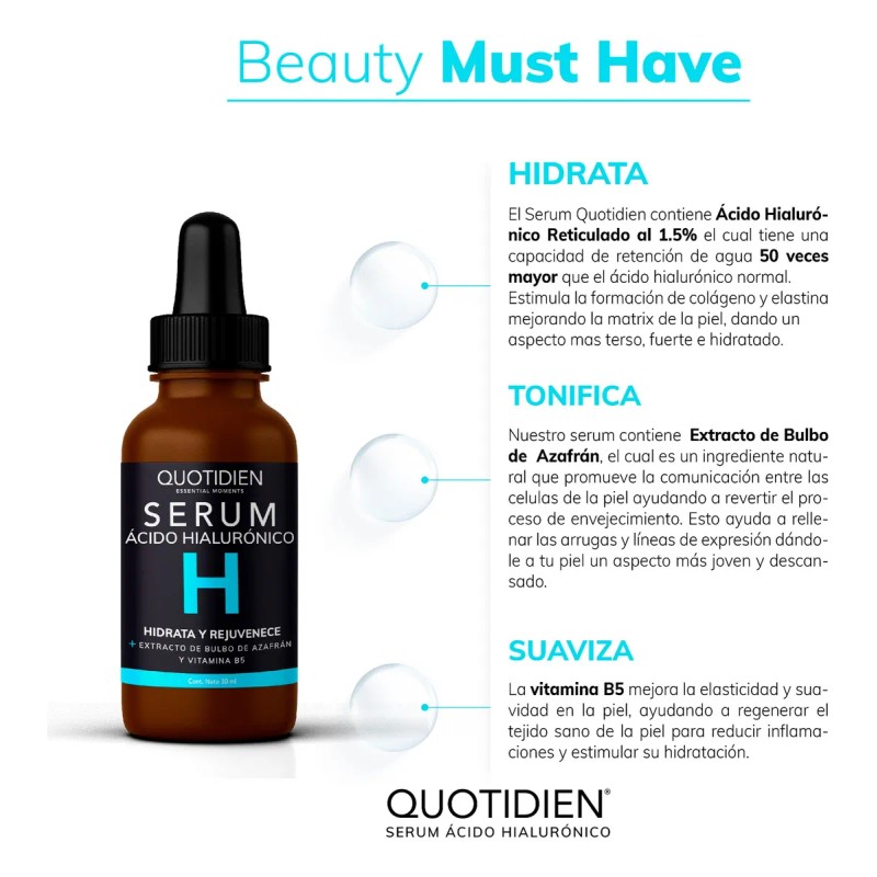 Serum es un suero facial de Ácido Hialurónico Reticulado al 1.5% + Vitamina B5 y extracto de Bulbo de Azafrán que ayuda a hidratar, rejuvenecer y reafirmar la piel. Contiene nutrientes esenciales para estimular la comunicación y regeneración celular mejorando visiblemente la matriz de la piel, para un rostro más terso, fuerte y joven.