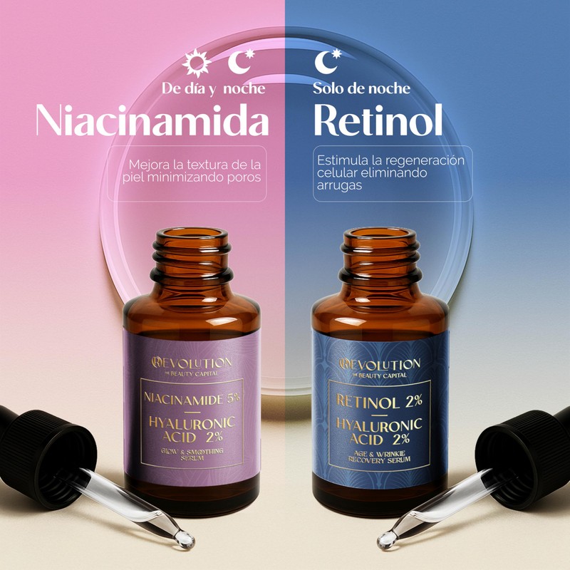 - Nuestro Serum nocturno concentrado de Retinol al 2% y Ácido Hialurónico al 2% Estimula la producción de colágeno y acelera la regeneración celular de la piel.