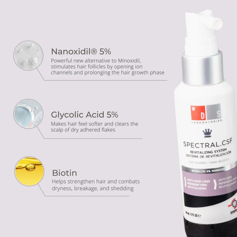 Spectral.CSF es un sérum a base de agua formulado por dermatólogos con ingredientes clave únicos de la más alta calidad para reducir los signos de caída del cabello y promover un cabello y cuero cabelludo de aspecto más saludable. Este sérum patentado de potentes aminoácidos concentrados, niacinamida y células madre minimiza los signos de caída del cabello y aumenta la apariencia de la densidad, el grosor y el volumen del cabello. Para obtener mejores resultados, úselo a diario. Siga con el champú y acondicionador Revita. Cepillo para el crecimiento del cabello, productos para el crecimiento del cabello, mascarilla para el cabello, aceite para el cabello, acondicionador sin enjuague, aceite de romero para el crecimiento del cabello, masajeador del cuero cabelludo, exfoliante para el cabello, spray para el cabello, aceite de romero, aceite de ricino, champú aclarante, aceite de coco, productos para el cabello rizado, champú para la caspa, champú seco, aceite para el cabello, productos de belleza, aceite de biotina, suplemento de biotina, aceite de castro, cepillos para cabello, aceite de coco, gomitas de colágeno, acondicionador profundo para cabello seco y dañado, spray desenredante, spray desenredante, seco tratamiento del cuero cabelludo, cuidado del cabello, productos para el cuidado del cabello para mujeres, desenredante del cabello, aerosol desenredante del cabello para mujeres, crecimiento del cabello para hombres, aceite para el crecimiento del cabello para mujeres negras, champú para el crecimiento del cabello, suplemento para el crecimiento del cabello, vitaminas para el crecimiento del cabello, vitaminas para el crecimiento del cabello, gomitas para la caída del cabello, champú para la caída del cabello, mascarilla para el crecimiento del cabello, masajeador para el crecimiento del cabello, crema hidratante para el cabello, espuma capilar, aceite capilar para cabello seco y dañado y en crecimiento, aceites capilares, aceites capilares para el crecimiento del cabello, productos capilares para mujer, tratamiento de regeneración capilar para hombres, reparación del cabello, masajeador del cuero cabelludo, depurador de cabello, sérum capilar para el crecimiento del cabello, champú para el cabello, productos para el cabello, herramientas de peinado, suplementos capilares para mujeres, tratamiento capilar, tratamiento capilar para cabello seco y dañado, aceites para el tratamiento del cabello, vitaminas para la caída del cabello para mujeres, vitaminas para el cabello más grueso, masajeador de cabeza para el crecimiento del cabello, exfoliante de cabeza, cuidado del cabello coreano, Spectral. Sérum capilar CSF: Spectral.CSF es un suero a base de agua formulado por dermatólogos con ingredientes clave únicos para reducir los signos reducen la caída del cabello y promueven un cabello y cuero cabelludo de aspecto más saludable. Este sérum patentado de potentes aminoácidos concentrados, niacinamida y células madre minimiza los signos de caída del cabello y aumenta la apariencia de la densidad, el grosor y el volumen del cabello. - Para quién es Spectral.CSF: Mujeres preocupadas por la caída y el adelgazamiento del cabello y que buscan un cabello más grueso y de aspecto más completo. - Qué hace: este sérum capilar mejora la apariencia de la cobertura y el volumen del cuero cabelludo, nutre e hidrata el cuero cabelludo y aumenta la apariencia del cabello densidad. - Uso sugerido: Agitar bien antes de usar. Aplica seis (6) pulverizaciones dos veces al día directamente sobre la zona afectada. Frote el líquido de manera uniforme. Lávese las manos con agua y jabón inmediatamente después de usarlo. Este es un sérum sin enjuague y no debe enjuagarse después de la aplicación. Para obtener mejores resultados, úselo a diario. - Tecnología de nanosomas: las fórmulas de DS Laboratories cuentan con nuestra tecnología patentada de nanosomas. Esta tecnología permite la liberación continua de los ingredientes activos, lo que crea una mayor eficacia con resultados más duraderos.
