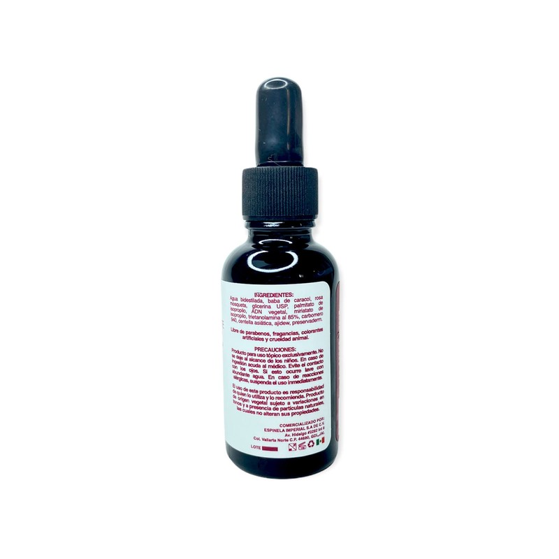 - ingredientes: Agua bidestilada, baba de caracol, rosa mosqueta, glicerina USP, palmitato de isopropilo, ADN vegetal, miriatato de isopropilo, trietanolamina al 85%, carbomero 940, centella asiática, ajidew, presevaderm.