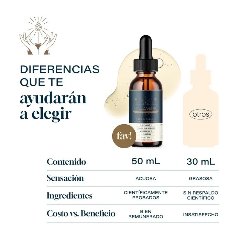 El Collagenic Serum Facial Aclarante de Piel es un innovador suero facial diseñado para proporcionar un cuidado integral de la piel del rostro y el contorno de ojos. Con un volumen de 50ml, ofrece un 60% más de contenido que los serums tradicionales de 30ml, asegurando una mayor duración y eficacia. Este producto de Miind Brands, parte de la línea Serum Facial - Suero Facial, está enriquecido con una potente mezcla de ingredientes activos, incluyendo Vitamina C, Colágeno Hidrolizado, Ácido Hialurónico, Retinol, Vitamina E y Elastina.