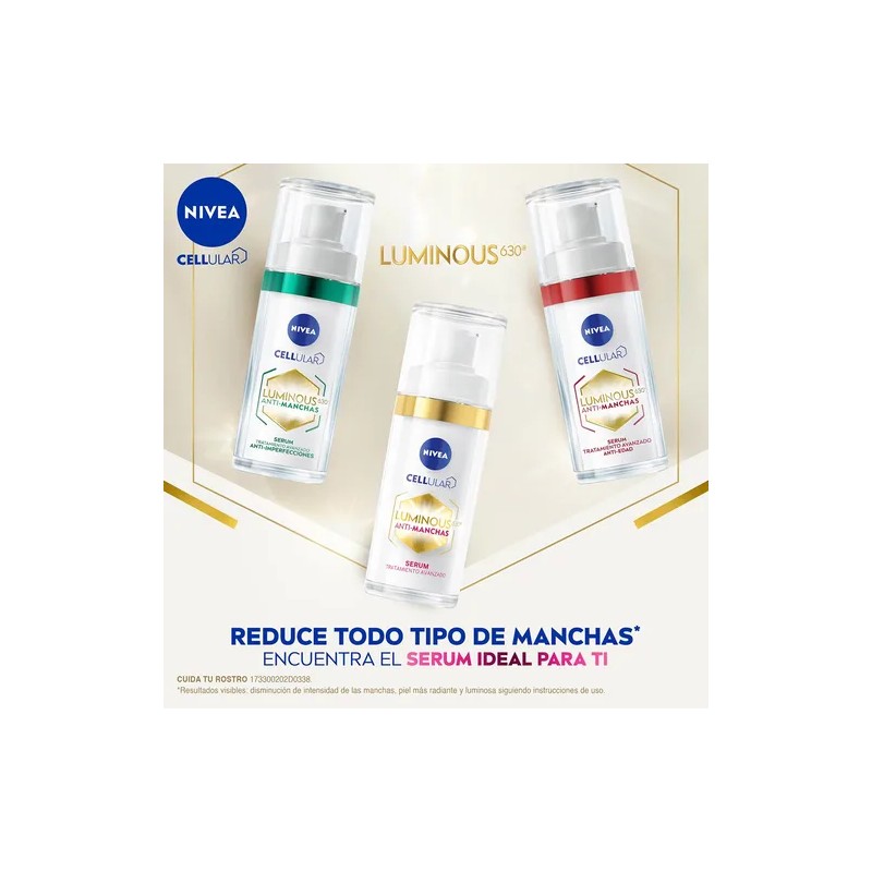 - Embárcate en la experiencia anti-manchas más avanzada con el Serum Facial Anti-Manchas Tratamiento Avanzado NIVEA Luminous 630 y disfruta de una piel luminosa y uniforme.